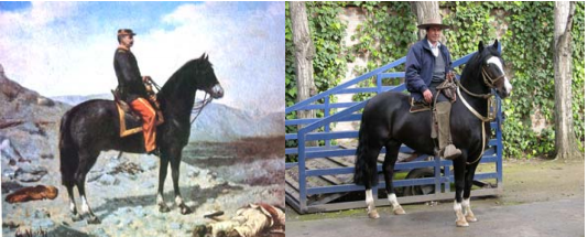 Nótese que el caballo que el General Baquedano usó en la Guerra del Pacífico, evidencia la misma morfología que el caballo chileno contemporáneo que monta el campeón Lalo Tamayo